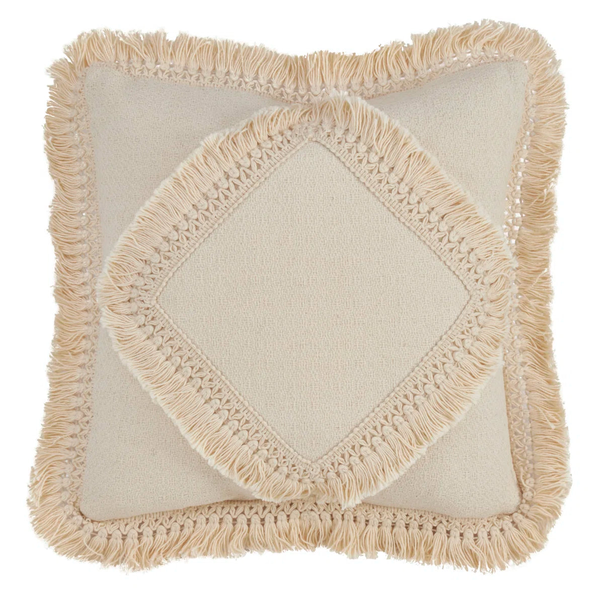 Elevate your space with this beautifully detailed Cotton Fringe Lace Appliqué Throw Pillow, crafted to bring warmth, texture, and elegance to any room. Featuring intricate lace appliqué and soft fringe edges, this pillow adds a refined, artisanal touch to sofas, beds, and accent chairs.